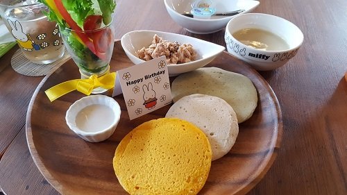 園内にはさまざまなフードスポットがたくさんあります。 食べ歩きできる屋台、軽食が食べられるカフェ、ロボットが調理するレストラン、野菜たっぷりビュッフェ、ちょっとリッチなフレンチレストランなどなど・・・。 そのほとんどでキッズ用のイスや食器が準備されていました♪ ただし、イスは木製のハイチェアーでベルトなしのものなので、しっかり腰が座っていないベビーにはちょっと早いかもしれません。また、キッズ用メニューがあるお店のリストは、ホームページに詳しく載っているので事前にチェックしておくと安心です。 私達も夕食で行ったレストランでは、大人は長崎名物のレモンステーキを、娘はハンバーグやエビフライの乗ったお子様ランチを、と、お互い満足のいく食事ができました。 また、滞在中いくつか行ったお店の中で、私のお気に入りだったのが、ミッフィーのカフェ「ナインチェカフェ」。ナチュラルな雰囲気のカフェで、女性客が多かったです。キッズ用メニューというわけではないのですが、三色パンケーキのオープンサンドを注文すると、娘もかわいくておいしそうな見た目に興味津々! パンケーキをちぎってあげると、とてもおいしそうにパクパク食べていました。小麦・卵・牛乳不使用のアレルギー対応メニューがあるのも特徴。2017年にオープンしたばかりのお店。小さな子ども連れファミリーにはオススメです♪