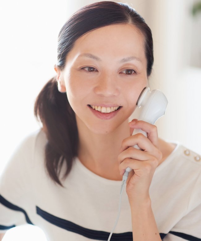 濃度の高い化粧水なら直接ヘッドにのせて使える。じかに振動や温かさを感じられるので気持ちよさは格別! 肌の表面からゆっくりと潤っていくのがわかる。