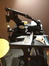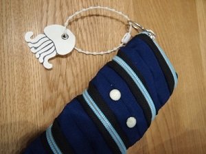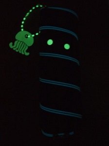 ポーチ本体が縫えたら、ボタン付け。このボタンも蓄光素材製でした。2つ並べて付けると、夜、暗い場所でポーチに目があるように見えるのだそう。さっそく、会場にあった専用の装置を使い、スタッフにサポートしてもらいながら、ボタンを自分で装着しました。専用の機械は、足のレバーで操作してボタンを装着する仕組み。なかなか面白い体験をさせて頂きました。仕上げは、蓄光素材を使ったタグ作り。タグの形は自由に切って形づくりするもよし、黒マジックで好きなイラストを描いてもよし。私は、息子が大好きな「深海の光るクラゲ」をイメージしてタグを作ってみました。タグをつけるチェーンも蓄光素材という徹底ぶり。ファスナーリングにタグを付けて、オリジナルの「光るモンスター風ポーチ」の完成です!! 少し不格好ですが、なかなかユーモラスな出来栄えで満足です。早く息子に見せてあげたい!