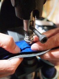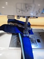 ミシンを使用するので「子供は小学生4年生以上の参加」が条件のため、小1のママである私は、今回はひとりで参加してみました。会場では、席に最新型ミシンが一人一台使用できるよう並んでいます。あまりミシンを使うのが得意ではない私ですが、最新型ミシンはかなり優秀と聞くので、私でもうまく縫えるかも…とちょっと期待。17:00よりワークショップがスタートし、まずは主役のファスナーを選びます。息子用に青をチョイス。スタッフの説明を聞きながら、少しずつミシンでファスナーを縫い合わせていきます。つるりとした質感の生地だったので、少々縫いづらくはありましたが、何とかポーチの形に縫い合わせることはできました。くるくるらせん状に縫い合わせると、なんとポーチの形になっていくではありませんか!