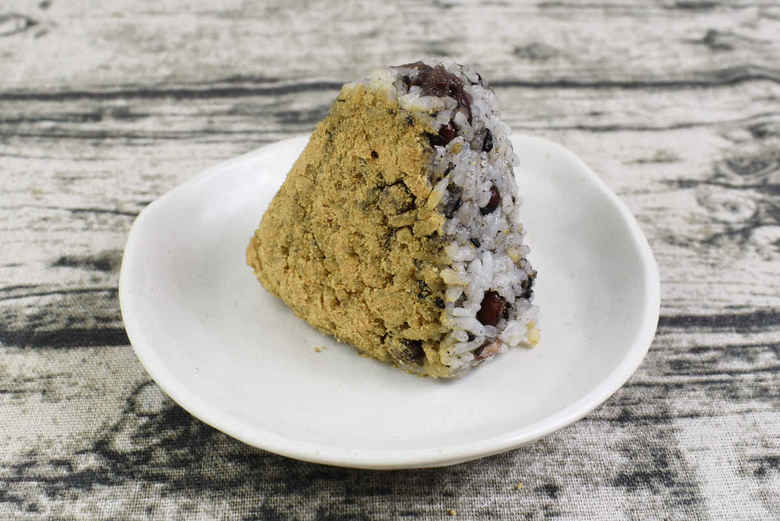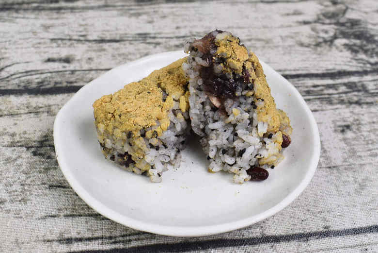 国産米を使用した同商品は、表面にきな粉がまぶされています。お米の他にも水煮小豆や黒ごま、粒あんなどが入っていました。パッケージを開封すると、きな粉のやさしい香りがふんわり。見た目だけでも十分におはぎ風を感じられますね。