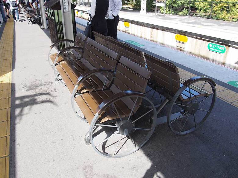 まずはベンチにご注目。嵐山駅のベンチには人力車のタイヤを模した飾りが取り付けられています。
