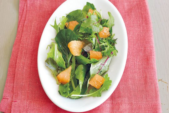 Aを混ぜ合わせ、ベビーリーフにかける。小さく切ったピンクグレープフルーツも好みでのせる。