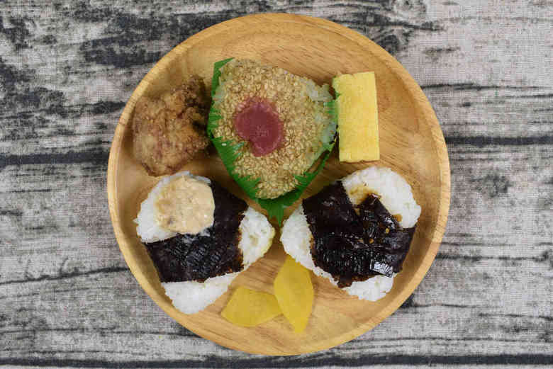四角いパッケージのフタを開けると、3種類のおむすびがお目見え。梅おむすびの表面にゴマが振りかけてあるおかげで、フワッと香ばしい香りが漂ってきます。ツナマヨや昆布はお米の上に具材がトッピングされており、それぞれ手のひらに収まるサイズ感でした。卵焼きや唐揚げも一切れずつ添えてあるため、お弁当のような感覚で食べられそう。