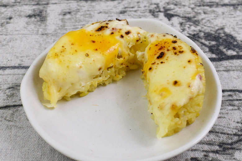 それでは、さっそくいただきましょう。ひと口食べた瞬間、ライスの粒々感と超濃厚なチーズを堪能できます。しっかり温めることで、ピザのようにチーズが伸びるのがポイント。こしょうやベーコンの味も際立っており、3種のチーズと相性抜群。チーズ好きにはたまらないおにぎりです!
