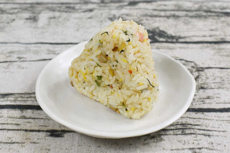 一般的なおにぎりと変わらない大きさの同商品。しかし、見た目はとても華やかで、野沢菜や錦糸卵・鮭などの食材が酢飯に混ぜ込まれていました。コンビニの人気商品“チャーハンおにぎり”を彷彿とさせる姿は、これから大ヒットする予感。