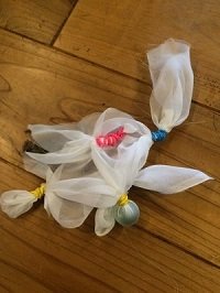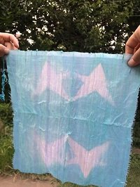 そのまま染めてもキレイですが、ビー玉を包んで輪ゴムでとめたり、星の木型に布を挟み込んだりすると、キレイな絞り模様が楽しめます。染める前に、絞ったままの状態で水に浸してから、藍染液につけるのがポイント。どのようにな柄がでるか、染め上るまでのお楽しみです!
