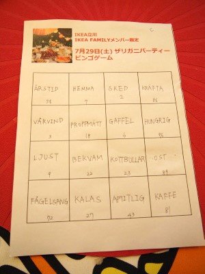 そしてパーティーも中盤になりますと、ビンゴゲームが始まりました。ザリガニパーティーのビンゴはちょっと通常のビンゴと違っていまして、マスが空の用紙が配られて、そこに事前に配布されていたスウェーデン語の単語一覧表を参考に各自が自由に単語を記入したものがビンゴシートになるという方式です。そして上位10名までに賞品が用意されていましたが、筆者一家は誰もビンゴに至らず…でした。どうも難しめの単語を選んだ方がビンゴに至る確率が高かった気がしましたが、結構会場は盛り上がりました。