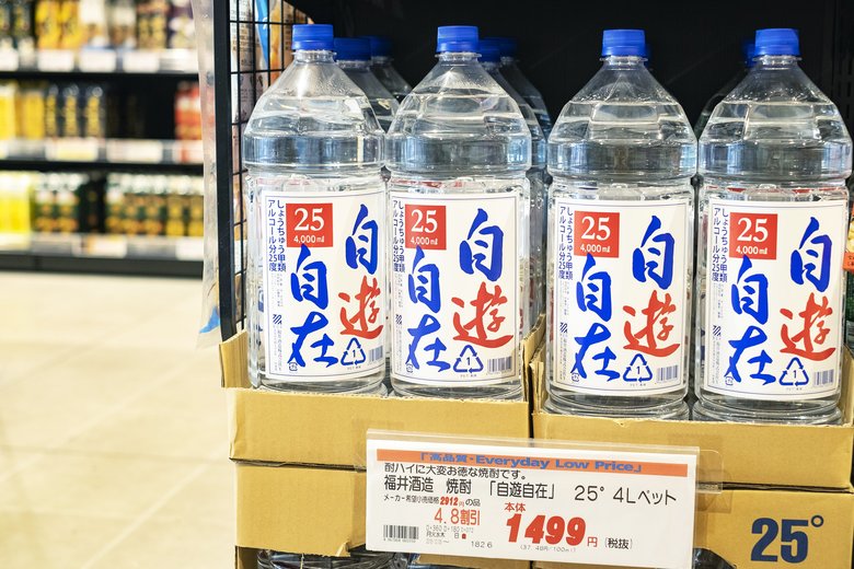 愛知県の福井酒造の「自遊自在」という焼酎も人気。4ℓ入りという大容量のペットボトルなので、焼酎派のパパがいるご家庭では重宝しそう。
