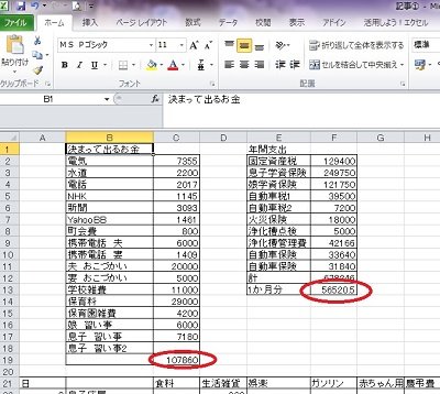 みなさんは家計簿をつけていますか?スマホアプリで入力する方、市販のノートにつけている方、面倒くさくてつけていない方、などなど様々だと思います。我が家では、ずっとエクセル家計簿。市販のものやスマホアプリは、自分の思うような項目別にわけることができなかったりしたので、自分にしっくりあったものをエクセルで作って入力しています。自分でひな型さえ作っておけば、あとは毎月入力するだけ。短時間で毎月の支出を把握することができるんです。まず、家計簿をつけて初めに思ったのが、年1回引き落とされる固定資産税や車の保険・税金。その月の家計簿につけていると、その月だけとんでもない赤字になったり、かと言って付けなかったら、なんだかとても貯金できているように感じたり。このやり方では、無駄遣いしているのかも把握できないと感じていました。そこで、年間を通じてお金がどのように流れているのかを確認したかったので、「年間支出」という項目をつくり、それを12で割って、毎月の支出とみなすことにしました。まず、エクセルで「毎月決まってでるお金」、「年間での支出」「その月での支出」と3項目に分けました。(2つの図は本当はワンシートのエクセルなのですが、はりつけられなかったため二つに分けています。) 3つの項目のうち、毎月決まって出るお金は、光熱費や、通信費、教育費、おこづかいなど。年間支出は、毎年年払しているもの。その月の支出は、食費や日用品、ガソリン代などになります。こちらは固定費です。