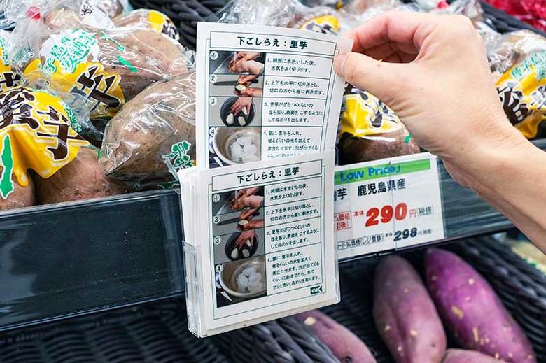 野菜売り場には、各野菜の下にレシピや、下ごしらえ方法などの紙が置かれていることも多いです。持ち帰れるので、便利!
