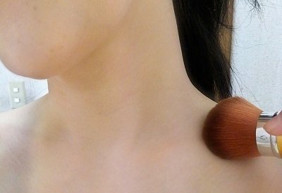 メイクするとき、仕上げのチークのついでにブラシで顔を優しくなでてみて。ポイントは、決して力を入れずリンパを意識して流すこと。この方法は、美容整骨の先生から教えてもらいました。私は普段から小顔矯正に通っていますが、先生がマッサージを終えたあと、必ず専用のおきめのブラシでさっとわたしの顔をなでるだけで血色がよくなるんです。特に専用のブラシを購入する必要がなく、手持ちのなるべくやわらかいブラシを代用可能。リンパに沿うのが基本ですが、内から耳前に向かって流すだけでもよいのだそう。最後は首にもブラシを流します。