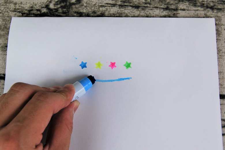 続いてスタンプ機能にトライ。ハンコを押すように、ペンを紙にギュッと押しつけます。ゆっくり離すと、綺麗な色と形をした「星マーク」が登場。重要な部分にマーカーを引く場合など、スタンプと合わせれば重要感も増すかもしれません。さらに「太い線を引きたい!」という時には、スタンプを押した状態で横にスライドさせましょう。文字の上を覆うほどの太さに変わりますよ。