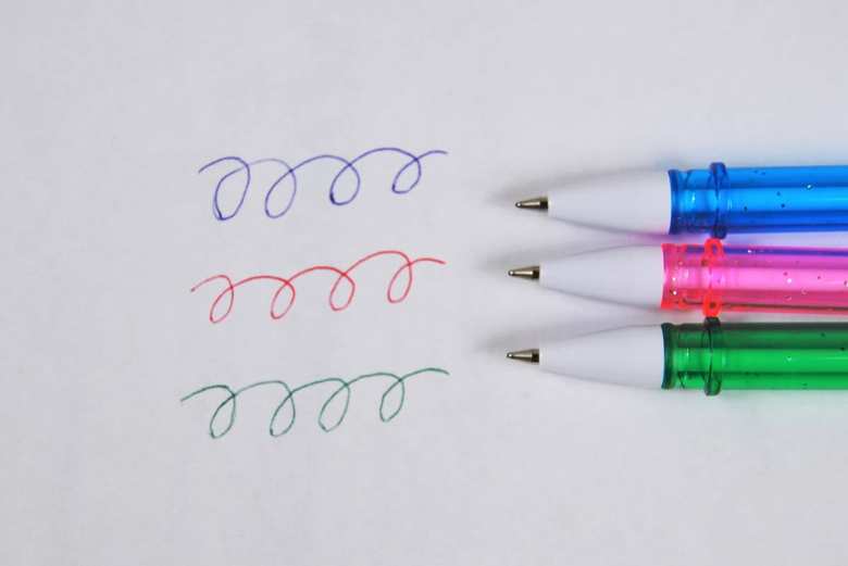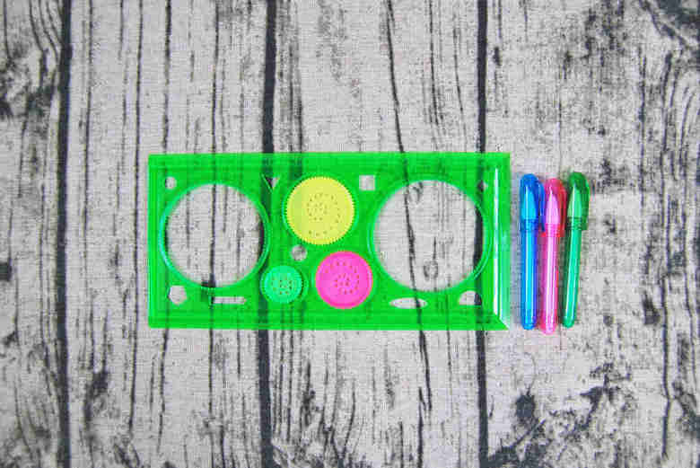 「くるりんデザイン定規」の特徴と言えば、幾何学模様があっという間に生み出せる画期的なところでしょう。蛍光グリーンの穴が開いた定規と、“イエロー・ピンク・グリーン”の歯車が入っています。また付属の小さなボールペンは、“赤・緑・ブルー”の3色。定規だけではなくボールペンもついてくるので、わざわざ自分でペンを用意する必要がありません。