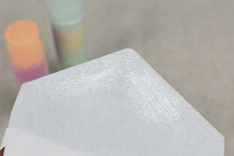 紙を用意して塗ってみたところ、塗った個所がうっすらとオレンジ色に。さらに色だけでなく、ラメもキラキラと輝いています。封筒ののりづけ部分に使えば、ひらいた際にキラキラして綺麗ですよ。