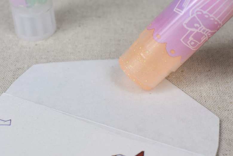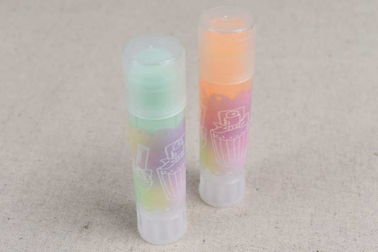 同商品には2つのスティックのりが同梱。どちらも透明な容器となっており、中身ののりが透けています。のりの色はパステルカラーで、グリーンとオレンジの2色。両方ともラメが入っているため、キラキラと輝いて綺麗です。