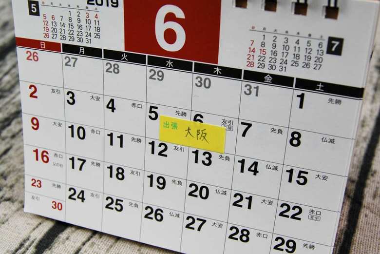 試しに黄色の「出張」をはがし、カレンダーに貼りつけてみました。5日と6日をまたぐように貼ると、「2日間出張に出る」ことがひと目でわかります。さらに「大阪」と書きこめば、行き先までばっちり。ネオンカラーが目立つので、一目で予定が確認できます。