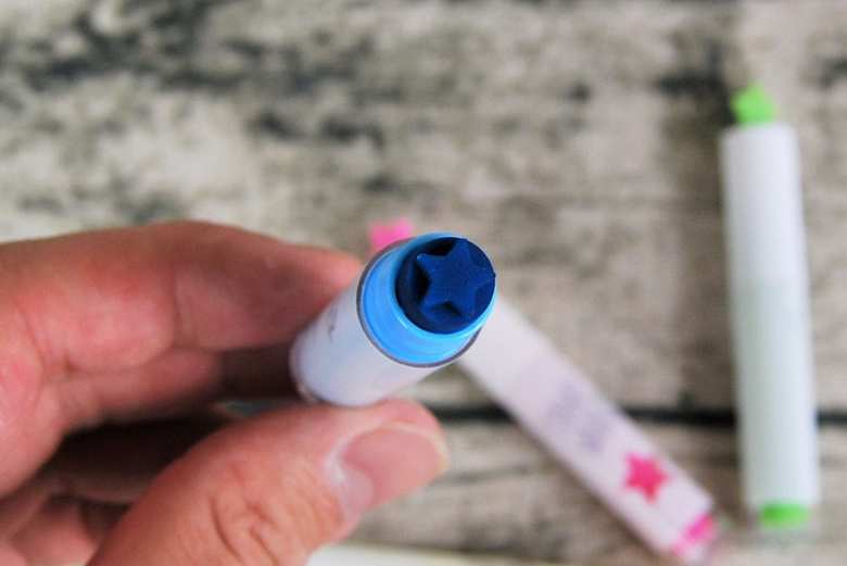 可愛らしいデザインにテンションが上がったところで、今度はキャップをあけて中身をチェックしてみます。筒状の先に現れた蛍光ペンは、なんと先端が星形。従来のマーカーペンとは違った形状ですが、果たして使い心地は…?
