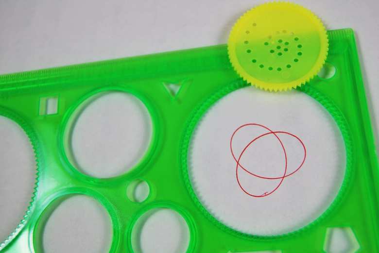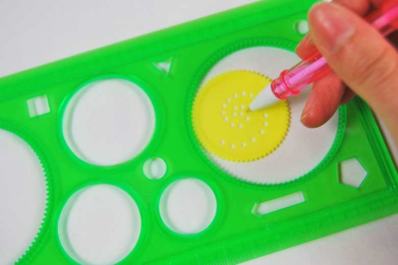 では実際に、「くるりんデザイン定規」で幾何学模様を描いてみましょう。定規にあるギザギザした穴へ、好きな大きさの歯車をセット。あとは歯車に開いている小さな穴にポールペンを刺して、ギザギザに合わせて手を動かすだけです。