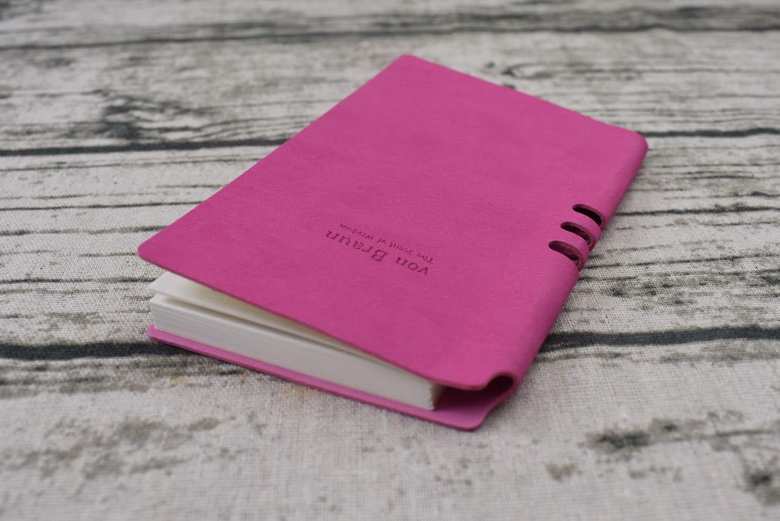 記録するためのアイテムといえば「ノート」。様々なタイプが販売されている中で、“周りとは一味違うノート”をゲットできたら嬉しいですよね。続いてご紹介するのは、鮮やかなピンクが高級感を漂わせるカバーが魅力のダイソーの「von Braun ノート ペンホルダー付」。