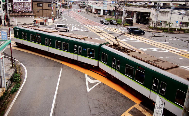 京津線のハイライトはびわ湖浜大津~上栄町間です。この区間では4両編成の電車が道路を走ります。京津線に使われる800系は一般車両よりも短い16m級ですが、それでも道路を走る姿は迫力満点。このような姿が見られる路線は全国でもここだけです。実は日本の法律では道路を走れる列車の長さは30mまで。800系は4両66mですが、「特例」で道路の上を走ってもOKということになっています。