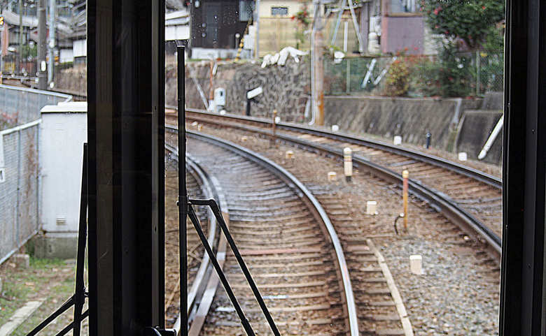 上栄町駅を過ぎると、右に左に急カーブの連続です。よく見ると、霧吹きのように線路が濡れていることがわかります。線路を濡らす理由は列車が曲がる際に発生する「キーキー」という音を減らすため。水を線路に撒くことで、車輪と線路の間に水の膜ができ摩擦を軽減できます。