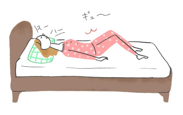 「ちつトレ」は、入浴後などのくつろげる時間に、リラックスできる状態でおこなうのが効果的です。 まずはあお向けに寝て、ひざの下に枕を入れます。次に両ひざを軽くゆるめてください。握りこぶし1個分くらいのすき間があればOKです。 それではさっそく、基本の呼吸法から。〝息を吐きながら締める〟〝息を吸いながらゆるめる〟感覚をつかみましょう。