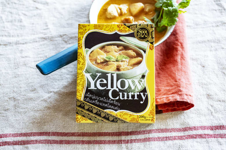 カルディコーヒーファームで買うことのできる「スータイ」のタイカレー。こちらは代表的なタイカレーのうちの一つ、イエローカレーです。ターメリックをはじめとしたさまざまなスパイスとココナッツミルクをベースとしたさらっとしたスープに、チキン、玉ねぎ、じゃがいもの具が入っています。