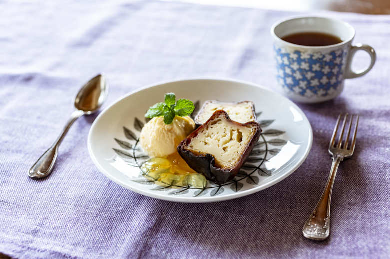 カヌレを小さく切り、プリン生地とともにオーブンで焼く。