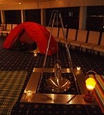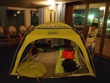 船内を見て筆者一家はびっくり仰天! 船内がほぼキャンプ場です!さすがアウトドアメーカーの重鎮・コールマンが協賛しただけあり、ありとあらゆる種類のテントが用意され、その他にランタン等のキャンプ用具もディスプレイされていて、雰囲気抜群でした! また、オープンデッキやトップデッキにはアウトドアチェアやレジャーシート等も用意されていて、文字通りデッキの上で横になれるセッティングになっていました。まさしく客船モデルナは「海上のピクニック広場」でした。さっそく筆者一家も仮眠をするテントを探し、中くらいの大きさのテントを拝借することに。テントで仮眠をするのが初めての息子も興奮状態で、テントに入った途端大の字でゴロゴロしていました…。仮眠テントが決まったら、出航セレモニーが行われるオープンデッキへすぐ移動しました。出航セレモニーは銅鑼を鳴らして出航となるのですが、今回はなんと!小学生くらいの女の子が即立候補して銅鑼を鳴らすお役目を果たし、客船モデルナは夜中の東京湾へと出航しました。