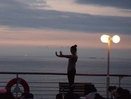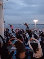 そして、朝の4:30からはトップデッキでモーニングヨガができるということで、とりあえずトップデッキに行ってみましたが、そこは既にヨガ参加希望者で満杯状態でした。ですので、私は後方で見学のみに。ちょうどモーニングヨガの始まったころに夜が明け始め、ヨガに参加している方達は、朝焼けの中本当に楽しそうでした。ここでは圧倒的に女性の参加率が高かったですね。心配していた天気も何とかこの時点では空に晴れ間がのぞいていたので、日の出が見られる期待が高まりました!
