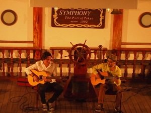 船内ではさまざまなイベントが開催され、飽きるヒマがありません。1:00からオープンデッキにてギターコンサートが開催されました。コンサート奏者のJAZZAMENCOのお二人の演奏は、フラメンコ音楽にジャズをミックスさせた独特のスタイルの旋律で、観客を大いに沸かせていました。乗客の皆様もすっかりくつろいで、アルコール片手に演奏に聞き入る方も徐々に増えていきました。(有料ですが、船内のバーラウンジでアルコールやソフトドリンクの提供も行われていました。)
