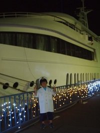 イベント当日、集合時間が11:00という事でしたので、早めの10:30頃に日の出ふ頭に到着。既に大勢の乗客が集まっていましたが、深夜のイベントですから年齢層高めの大人のグループが多かった印象です。日中と夜では全く東京湾の雰囲気もガラリと変わり、ライトアップされた客船はロマンチックな雰囲気。早速息子にクルーの衣装を着せて(笑)ライトアップされた客船と記念撮影をしました。