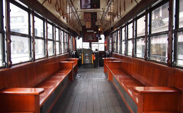 1両目と2両目でデザインが異なります。こちらは濃色の木材を使っています。「MOMO」のダイヤも岡山電気軌道のホームページで公開されています。