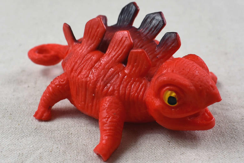 「ぽふぽふ風船」はゴムのような素材で覆われた“恐竜の風船”。近くで見てみると、思ったよりも精巧に作られているためとてもリアルな印象です。全身赤色でインパクト抜群の見た目ですが、私は「可愛い」と思いました。