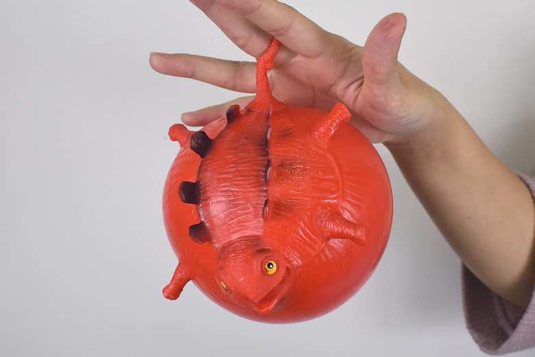 同商品には風船を膨らますためのストローも。膨らませたあとは尻尾部分の輪っかに指を通せば“ヨーヨー”として遊べます。試しに膨らませてみたところ、恐竜が徐々に大きくなり“まん丸”の姿に。子どもにウケそうな見た目なので、膨らますだけで盛り上がるかも。