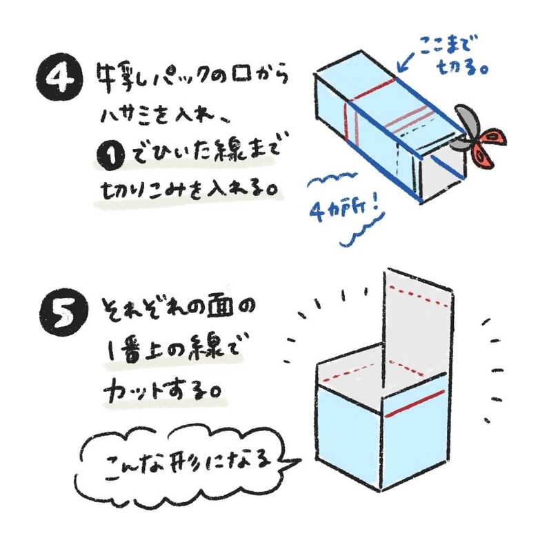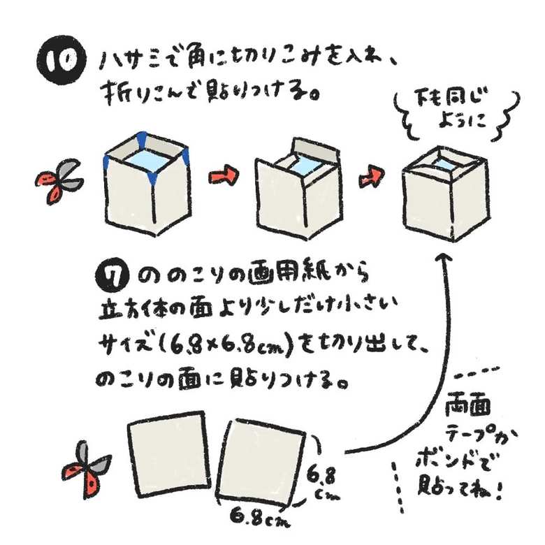 牛乳パックから作るサイコロと、サイコロと同じ絵柄を描いたカードを作って遊びます。