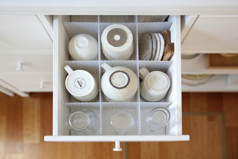 普段使いのカップ類は引き出しに収納。すべり止めマットを敷き、 無印良品の仕切りで分割。手前から、コップ、コーヒーカップ、湯 のみとゾーンニングして、同じものを重ねて収納している。どこか があいても、ゆがまない丈夫な仕切りが大活躍。