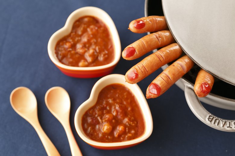 1. 写真下のように、ウインナの先端を爪に見えるように削ぎ切りにする。 爪風にカットした面だけに切りこみを入れてゆでると、関節のシワに見えていっそう不気味に。スープの入った鍋に5本をバランスよくはさんで、爪部分にケチャッ プをつけたら、でき上がり。