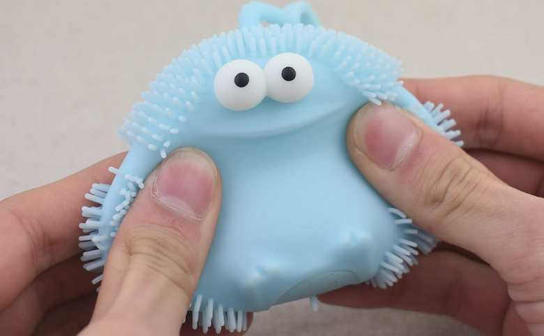 同商品はヨーヨーのようにペンギンを“ぽふぽふ”する室内おもちゃ。輪っかの先には、背中から両腕にかけて“イボイボ”がついた“柔らかいペンギン”がぶら下がっています。手のひらサイズでキュートな見た目ですが、手で握るとペンギンのお腹や頭などが“ぶにゅ~”と膨らむ仕様に。目は“くちばし”よりも前に飛び出るほど大きく、何処となく“コミカルさ”も漂っています。