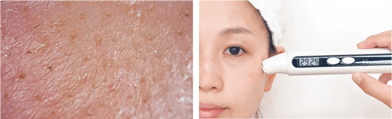 ところどころに毛穴の黒ずみが目立つ。アイメイクのラメも落ちきっていない。また、肌の水分量は想像以上に乾燥している数値が出て、がっかり。計測中も、すでに肌がつっぱっている。