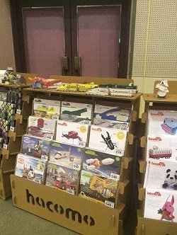 hacomo株式会社主催の段ボール商品企画販売やイベント企画などをやっている会社から販売されている工作キットを購入し、その場で作る事ができます。 新幹線や恐竜、ウサギなどの小動物も段ボールで作って飾ってありました。 インターネットでの販売もしています。個人的には、段ボールで作るキッチンがほしいと思いましした。