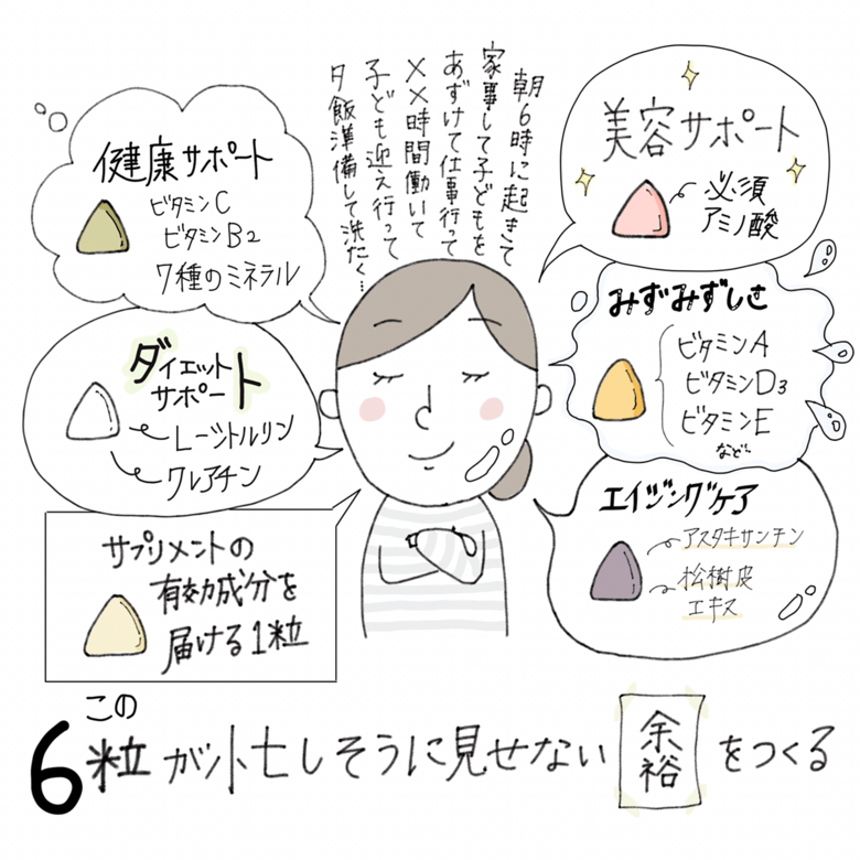 それぞれに効果が異なる6粒でママが欲しいケアが、まるっと完了。