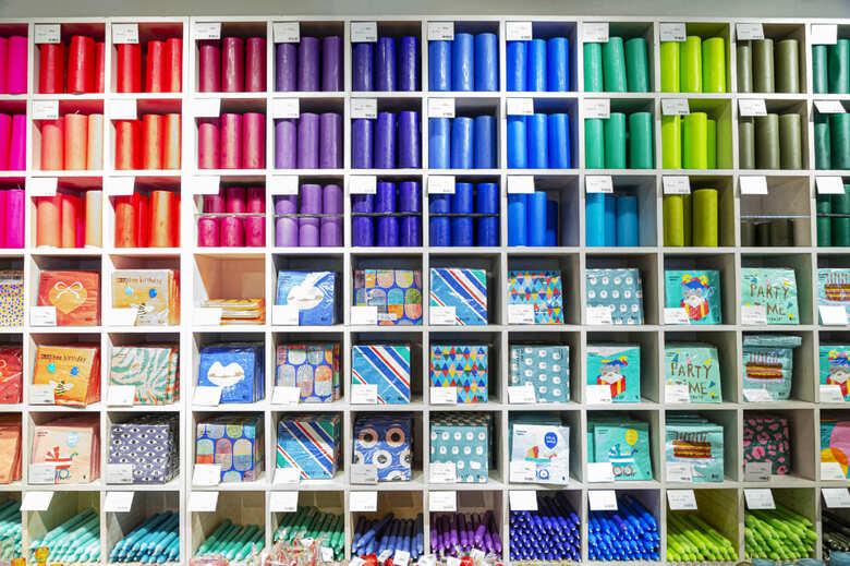 ナプキンの上に並ぶ円柱状のものはキャンドルです。まるで箱の中の色鉛筆のようにグラデーションカラーで並ぶキャンドルは、フライング タイガー コペンハーゲンの象徴でもあります。いっそのこと全てのカラーを並べてみると、ポップで素敵なインテリアになりそう!