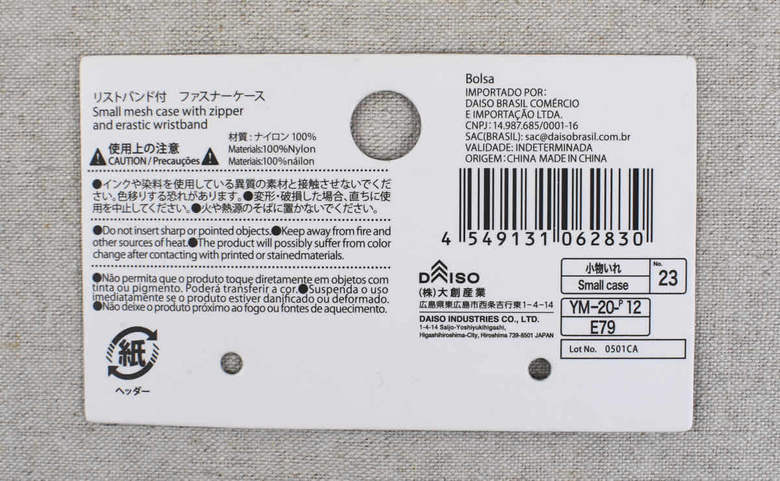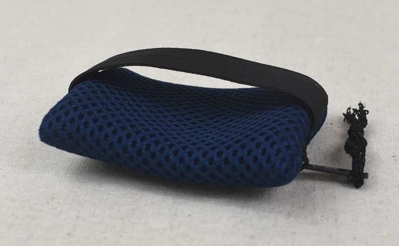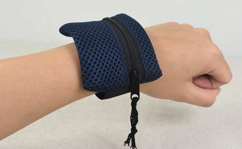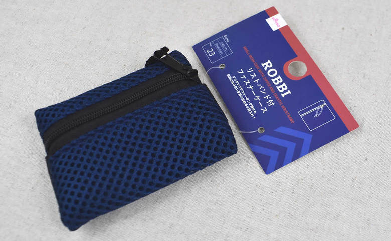 同商品はその名の通り、リストバンドが付いたファスナーケース。ケースのサイズは9×7cmほどで、ネイビーのメッシュ生地が特徴です。裏面には幅2.5cmほどの太めのゴムが縫いつけられており、手首に巻いて使える仕様に。実際に巻いてみるとスカスカしすぎることもなく、ちょうどいいぴったり感で装着できました。