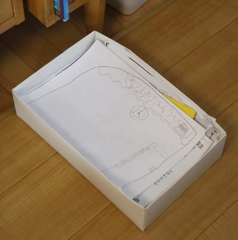 A4サイズの紙がぴったり入る空き箱を活用。子どもが座って絵を描くとき、振りむけば手が届く場所に置いている。「床に散乱していたのが嘘のようです!」(かずこさん)