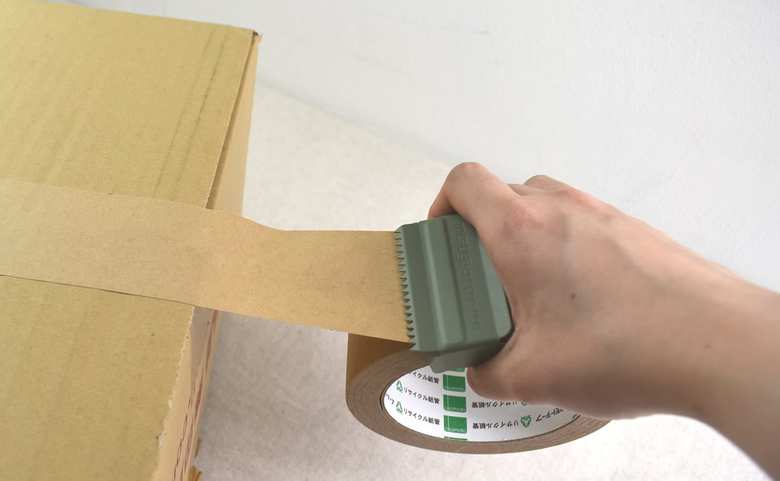 まずは商品の両端を折り曲げ、クラフトテープ本体に引っ掛ければ準備完了。さっそく試してみたところ、力をほとんど入れずに切断することができました。片手でも切れてしまう手軽さは忙しい作業時に重宝しそう。