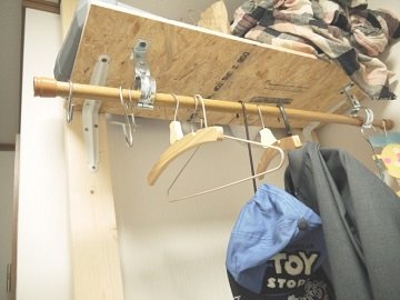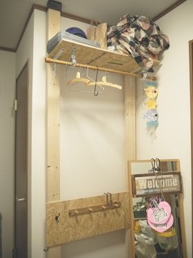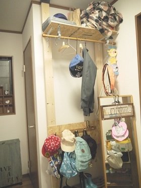 私は上部に棚板をつけて収納場所に。使用頻度低めのアウトドアグッズはここに収納。さらに、その棚板に突っ張り棒を渡してハンガーラック風にアレンジ。大人用のアウターなどはハンガーに掛けて収納できるようにしました。低い位置には板を張ってその上からフックを取りつけ、子供のアウターや保育園セット、帽子などを掛ける収納に。