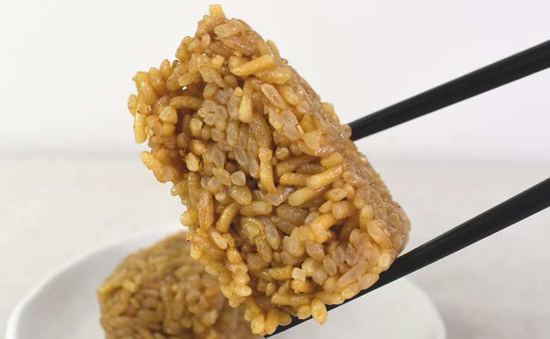 おむすびのパッケージは白色、青色、黄色を基調としたデザイン。「ペヤングソースやきそば」を彷彿とさせる見た目をしており、セブンのこだわりを感じられます。パッケージから取り出してみると、ソース色に染められた三角形のおむすびが登場。