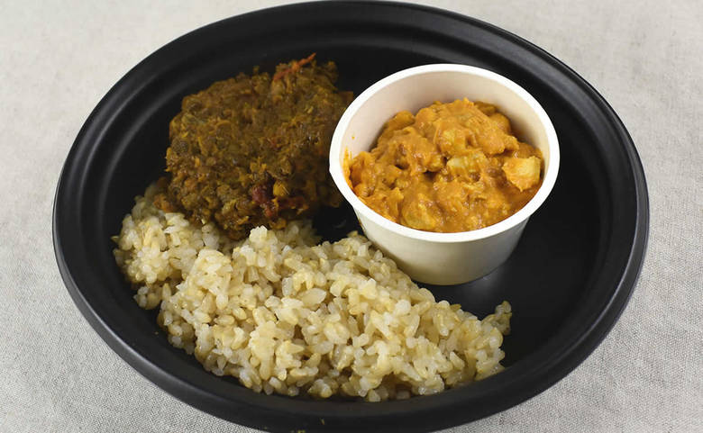 同商品は“チキンカレー”と“ダールカレー”の他に、玄米ご飯をたっぷり味わえます。オレンジ色のチキンカレーからは、ココナッツミルクの甘い香りがふんわり。いかにも辛そうな“ダールカレー”には小さなレンズ豆がたくさん入っていました。
